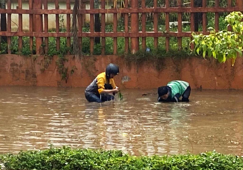 Nặng nhất là khu vực gần ngã ba trung tâm huyện, với mực nước dâng cao gần nửa mét, khiến nhiều phương tiện xe máy không thể lưu thông. Chứng kiến tình cảnh này, Ating Ly - nhân viên giao hàng tiết kiệm và Lê Đức Linh - bưu tá Bưu điện Đông Giang đã bỏ dở công việc, cùng nhau lội nước nhặt rác, giúp khơi thông miệng cống.