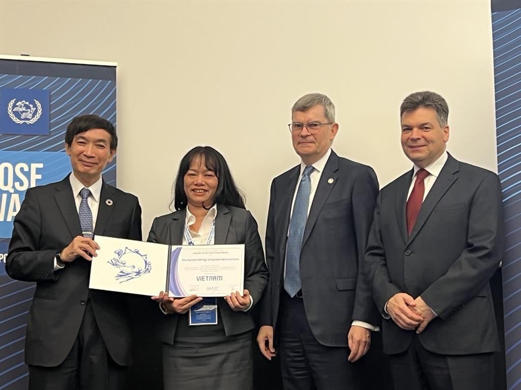 Tổng giám đốc UPU Metoki Masahiko, Chủ tịch Hội đồng POC Jean Paul Forceville,  Chủ tịch Hội đồng Quỹ Chất lượng dịch vụ QSF UPU Aimé Theubet trao chứng nhận vinh danh cho Phó Tổng giám đốc Bưu điện Việt Nam Chu Thị Lan Hương