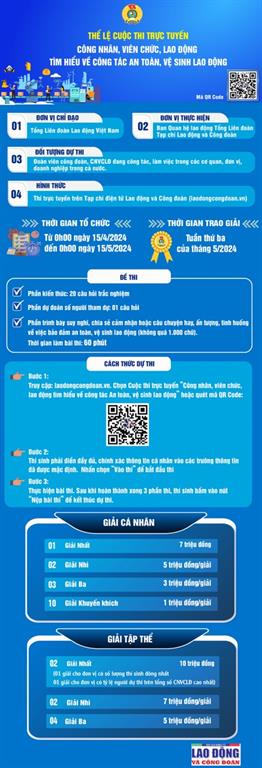 Thực hiện Kế hoạch số 51/KH-TLĐ ngày 08/4/2024 của Tổng Liên đoàn Lao động Việt Nam về việc tổ chức Cuộc thi trực tuyến “Công nhân, viên chức, lao động tìm hiểu về công tác An toàn, vệ sinh lao động”, Ban Thường vụ Công đoàn Thông tin và Truyền thông Việt Nam (Công đoàn TTTTVN) thông báo và đề nghị các công đoàn trực thuộc tuyên truyền, vận động công nhân, viên chức, lao động (CNVCLĐ), đoàn viên công đoàn tham gia hưởng ứng cuộc thi