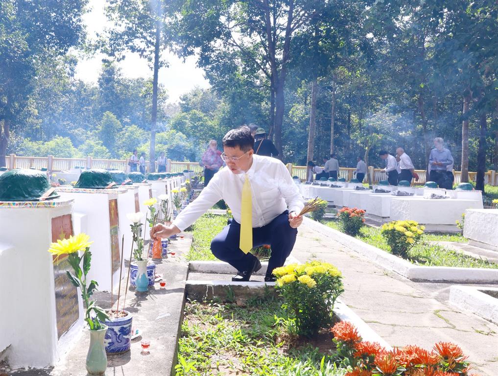 Sau lễ dâng hương tại nghĩa trang ngành TT&TT, đoàn cũng đến dâng hương tại Nghĩa trang liệt sĩ Đồi 82, Tây Ninh và thăm Nhà Truyền thống Giao bưu và Thông tin (R) tại Khu di tích Trung ương cục Miền Nam. Thay mặt Bộ TT&TT, Bộ trưởng Nguyễn Mạnh Hùng đã trao tặng số tiền 250 triệu đồng cho Quỹ đền ơn đáp nghĩa tỉnh Tây Ninh.