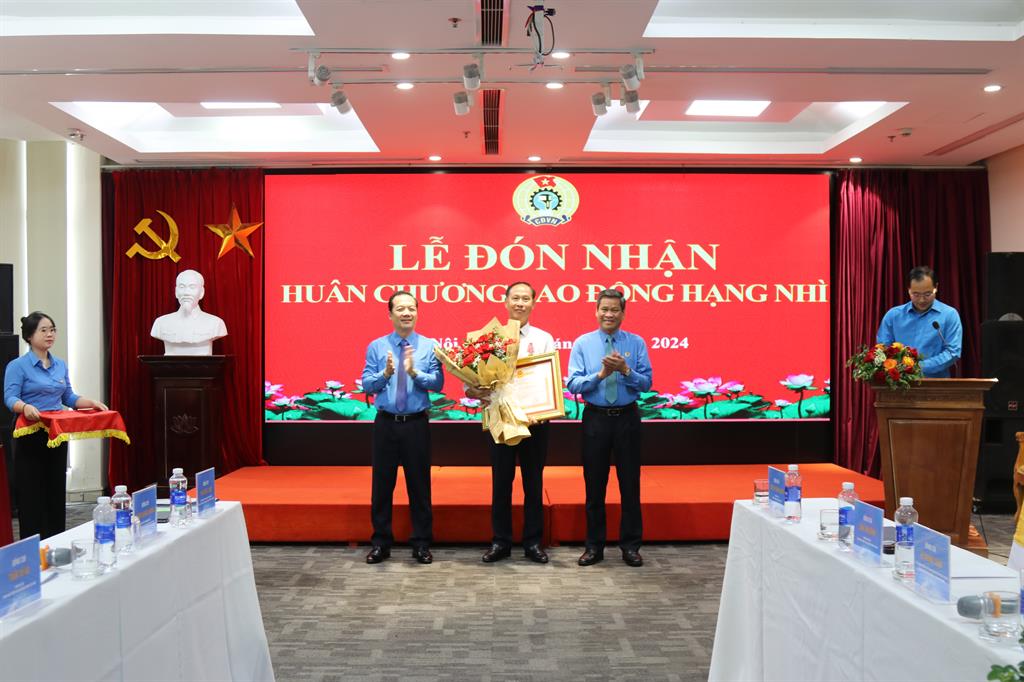 Đ/c Huỳnh Thanh Xuân, Phó Chủ tịch TLĐ LĐVN và đ/c Phạm Đức Long, Thứ trưởng Bộ TTTT, Chủ tịch Công đoàn TTTT Việt Nam trao Huân chương Lao động hạng Nhì cho đ/c Chu Văn Bình