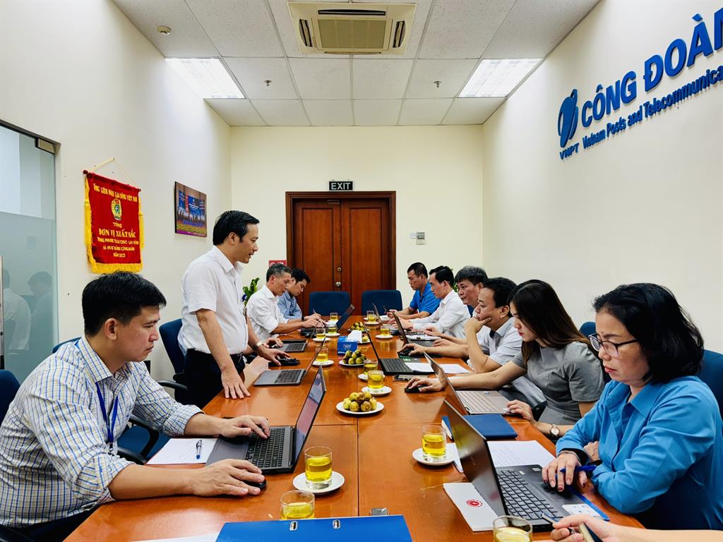 Làm việc với đoàn giám sát có Đồng chí Nguyễn Anh Tuấn, Chủ tịch Công đoàn VNPT, Đồng chí Triệu Tiến Thắng PCT TT và Trưởng các ban, Chánh văn phòng, Kế toán trưởng, Ủy ban kiểm tra Công đoàn VNPT tham dự.
