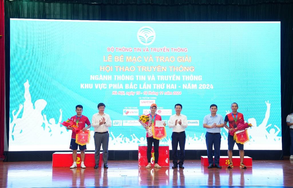 Bộ trưởng Nguyễn Mạnh Hùng trao giải nhất cho VĐV Trịnh Quang Trung – đoàn thể thao MobiFone nội dung 5000m môn chạy việt dã