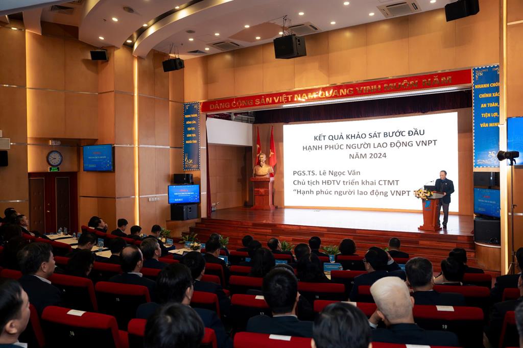 PGS.TS Lê Ngọc Văn - Chủ tịch HĐTV triển khai CTMT “Hạnh phúc người lao động VNPT” trình bày kết quả khảo sát hạnh phúc người lao động VNPT năm 2024